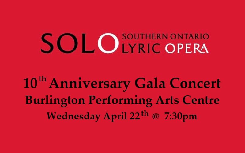 The Southern Ontario Lyric Opera (SOLO) is turning 10. To celebrate come see this special closing concert of our 10th Anniversary Season. Returning from our recent production of Tosca are Soprano Maria Vetere, and Tenor Romulo Delgado, along with members of our Youth and Adult Chorus, and full orchestra. We will perform some of the greatest and most beloved moments in Opera! It promises to be a very memorable evening of the best that Opera has to offer. Hope to see you there!